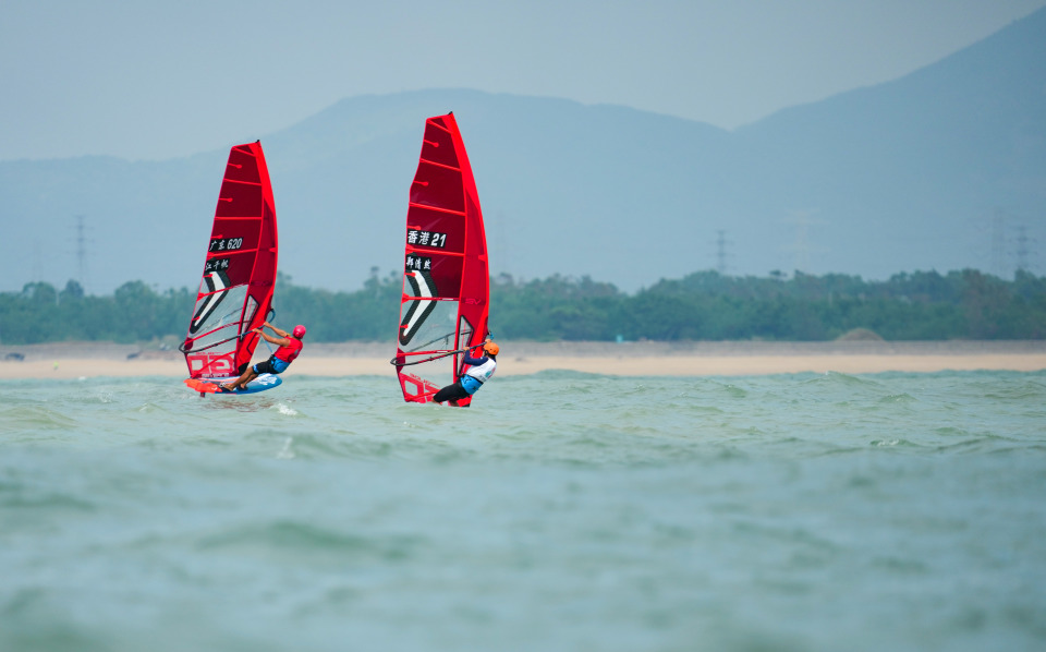 10月30日,广东队选手江千帆(左)和香港队选手郑清然在男子水翼帆板级奖牌赛中。最终,江千帆获得季军,郑清然获得第四名。新华社记者 晋美多吉 摄